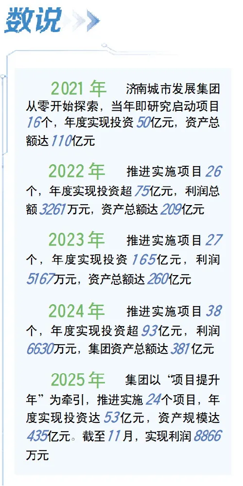 5年间,济南城市发展集团围绕市委、市政府重大发展战略,抢抓黄河重大国家战略机遇,聚焦“城市开发、投资、建设、运营”与“城乡融合”两大核心业务,以高质量党建引领高质量发展,深入推进城市更新、科技创新、产业创新,现已形成城市建设、城市运营、城市服务、城乡融合四大业务板块,集团资产规模突破435亿元,获得AAA主体信用评级,实现了从城市建设者向城市运营服务商、产业生态构建者和价值创造引领者的战略转型,获“‘推动中国住房租赁发展进程’百强企业”等荣誉。