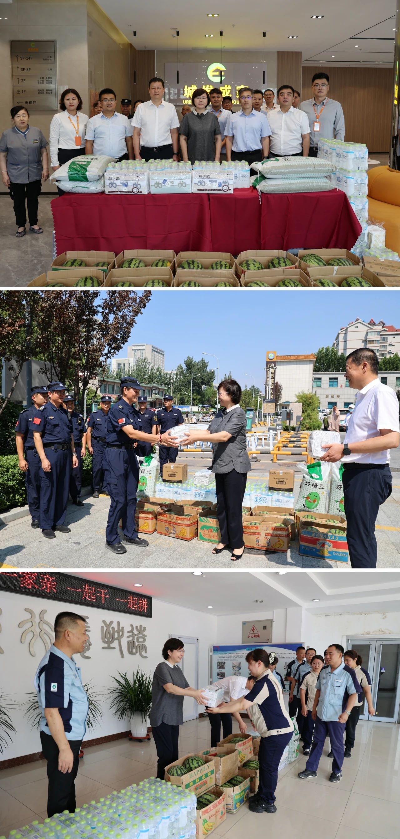 在静态交通集团交通设施号牌制作中心和济南剧院项目施工现场,殷光伟、霍仁禄一行将精心准备的矿泉水、西瓜、绿豆、驱蚊液等清凉物资送到职工手中。殷光伟详细询问了工程进度、安全生产管理特别是防暑降温措施的落实情况。“大家辛苦了!一定要注意防暑降温,安全第一!”对职工们不畏酷暑、坚守岗位的奉献精神,殷光伟表示高度赞扬,他反复叮嘱项目负责人和一线职工,务必科学安排作业时间,落实好轮休制度,确保劳保用品配备到位、防暑药品充足供应,切实保障大家的身体健康和劳动安全。